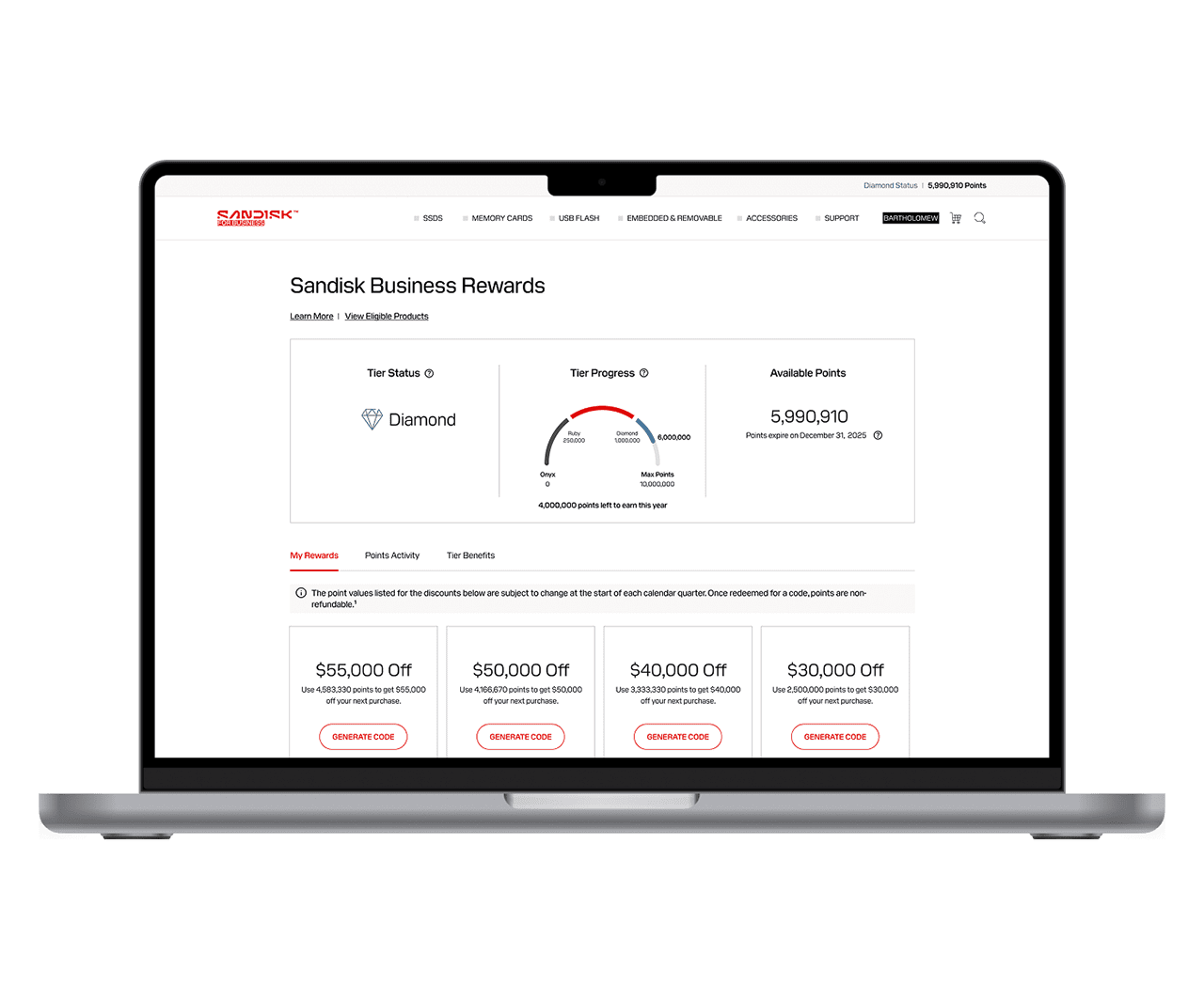Approved customers have access to track and redeem points for discount codes in their member account. Available discount codes depend on the customer’s available point balance. Once generated, discount codes can be applied during checkout toward any products sold on the Sandisk online store.