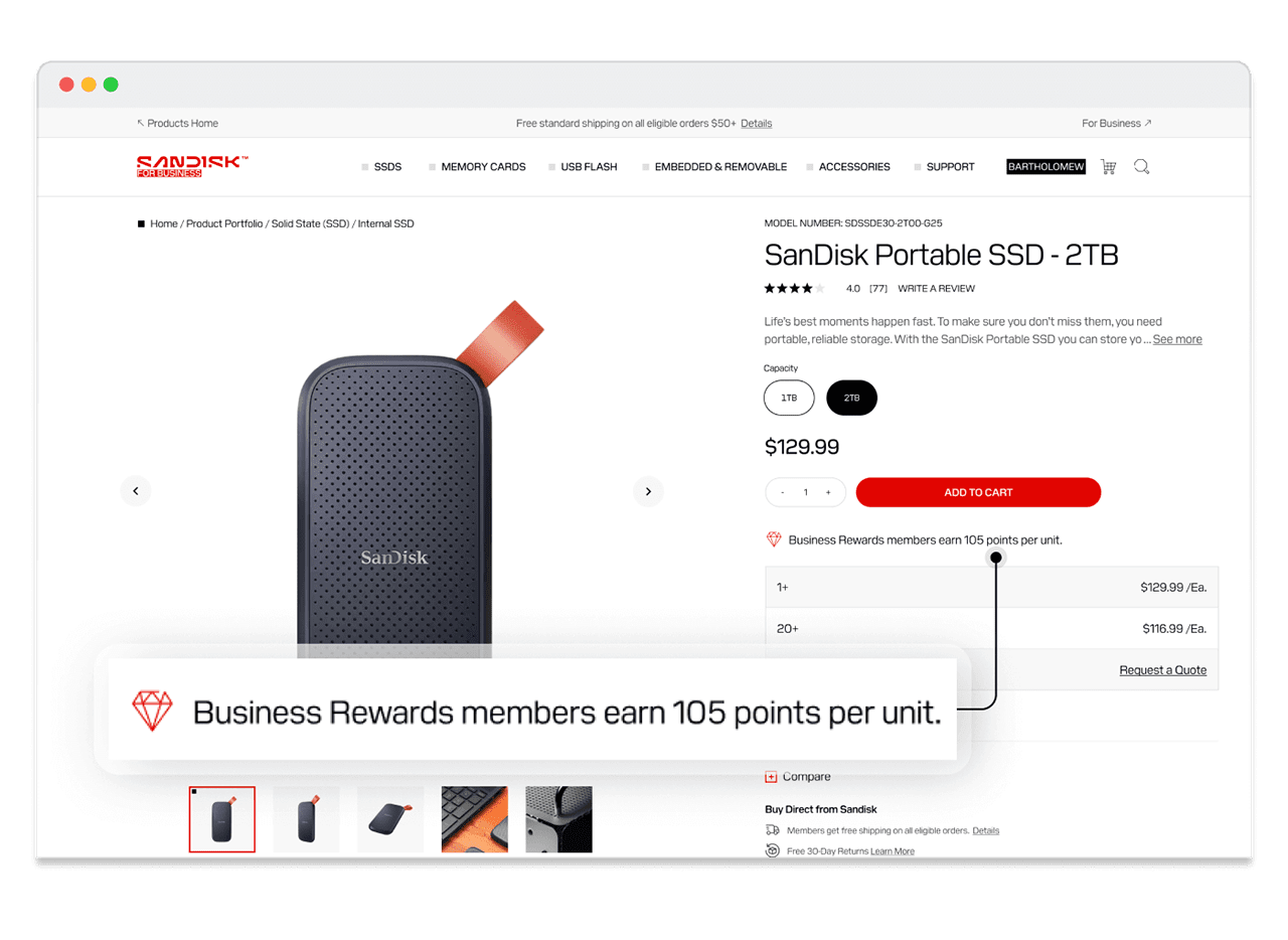 Participating businesses1 earn points on qualifying purchases from the Sandisk online store and Sandisk-authorized distributors. Points earned from purchases and/or other earning activities can be redeemed for discounts on future Sandisk online store purchases.